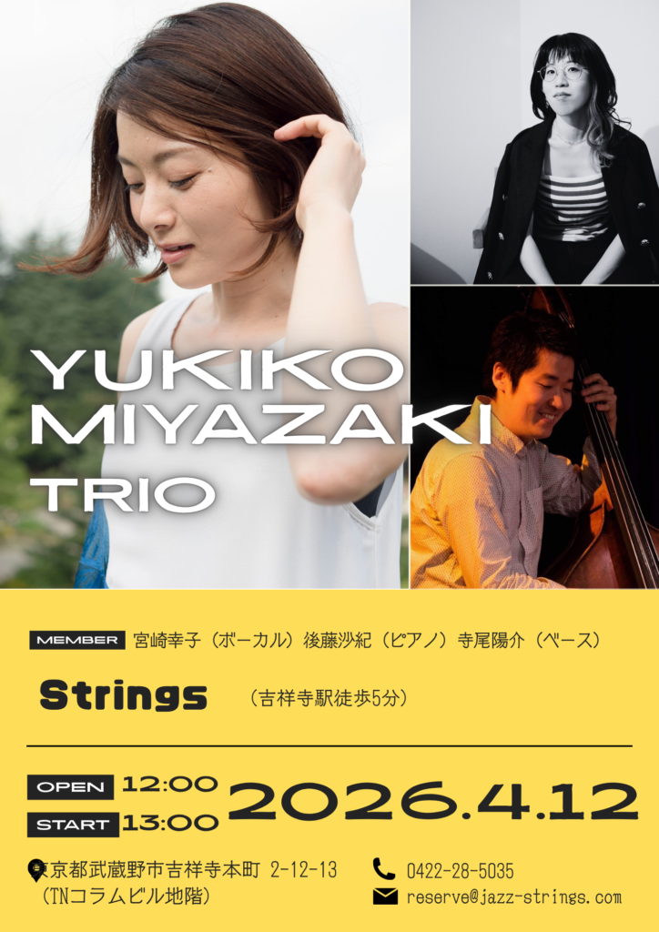 2026/4/12@吉祥寺Stringsで歌います ピアノの存在感が圧巻で、食事も美味しいお店です。 お昼間のライブですので、週末のお出かけがてらいらしてくださいね。 ごさきさん、寺尾君との共演もめちゃくちゃ楽しみです!!! Posted on 2026年3月29日 by yuki Categories: ブログ